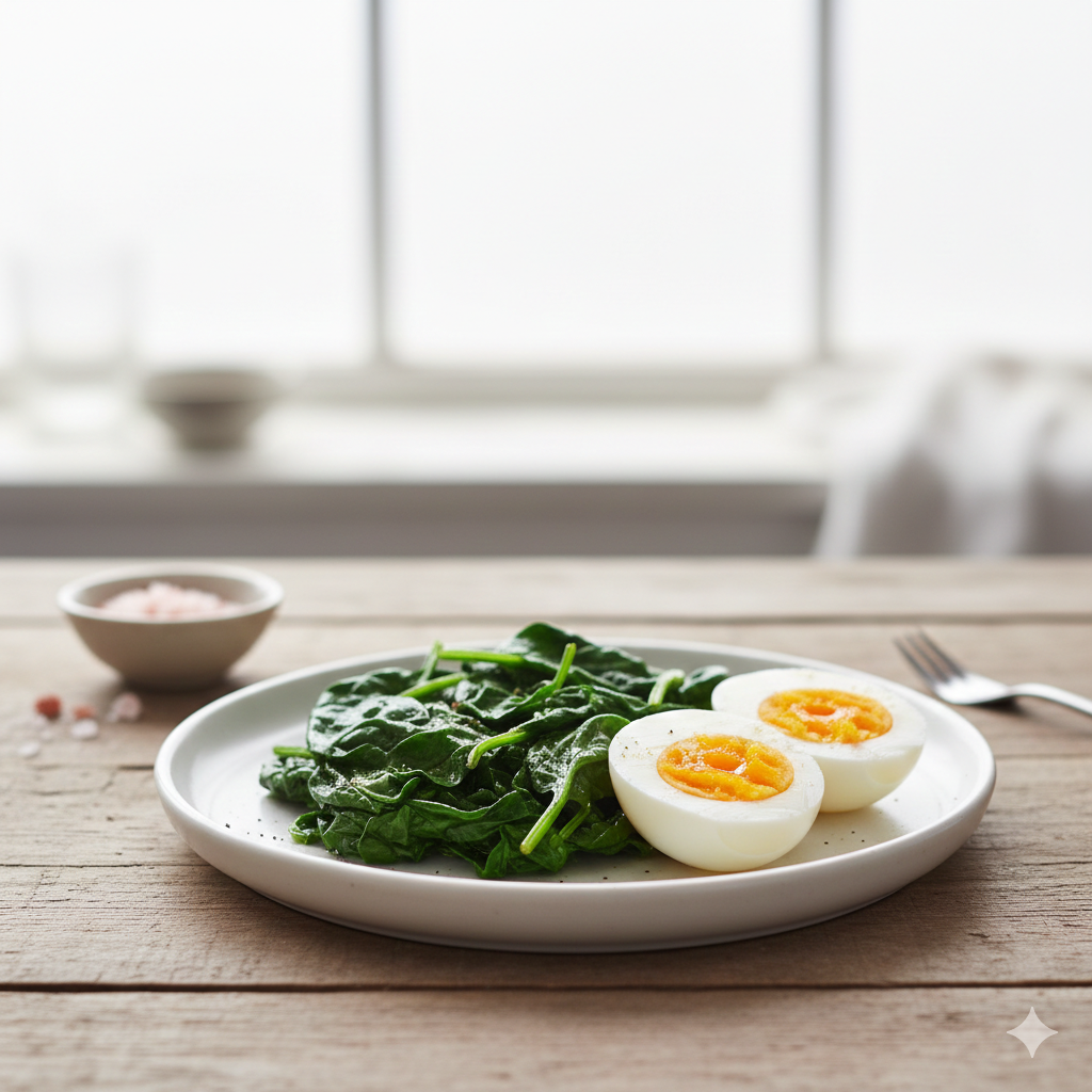 Pela el huevo y acompaña con la espinaca.